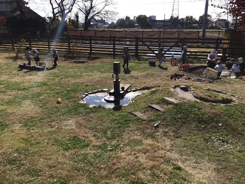 木のぬくもりいっぱいの園舎は、自然のエネルギーを活用した冷暖房システムを使用し、快適な環境を整えています。広い芝生の園庭には、井戸水のガチャポンプやスパイラル水流、六角形の砂場エリアがあり、裸足で思い切り遊ぶことができます。冬以外は園庭でも裸足で過ごすので、五感がしっかりと鍛えられるとのことです。